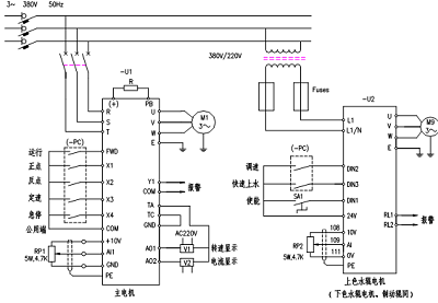 变频器本身具备过电流、过电压、欠电压、接地、过热、过载、缺相等多项警示及保护功能,这些功能足以构成对电动机的保护,无须另加保护环节,直接接于变频器的输出端子上即可。而变频器的电源输入端保护相对较为薄弱,在电网和电柜进线处我们加有隔离开关分断装置,在三相变频器我们加有过流保护的无熔丝断路器,单相变频器前另加变压器保护,以防止有些地区电源电压过高直接损坏变频器。变频器的动作由PLC控制,控制线直接接于PLC的输出点上,中间无一接触器控制。故障继电器输出点接于PLC的输入点上,报警时整机停止动作。